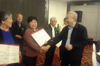 省老科协理事长范兴元同志为赵爱玲同志颁发中国老科协奖获奖证书